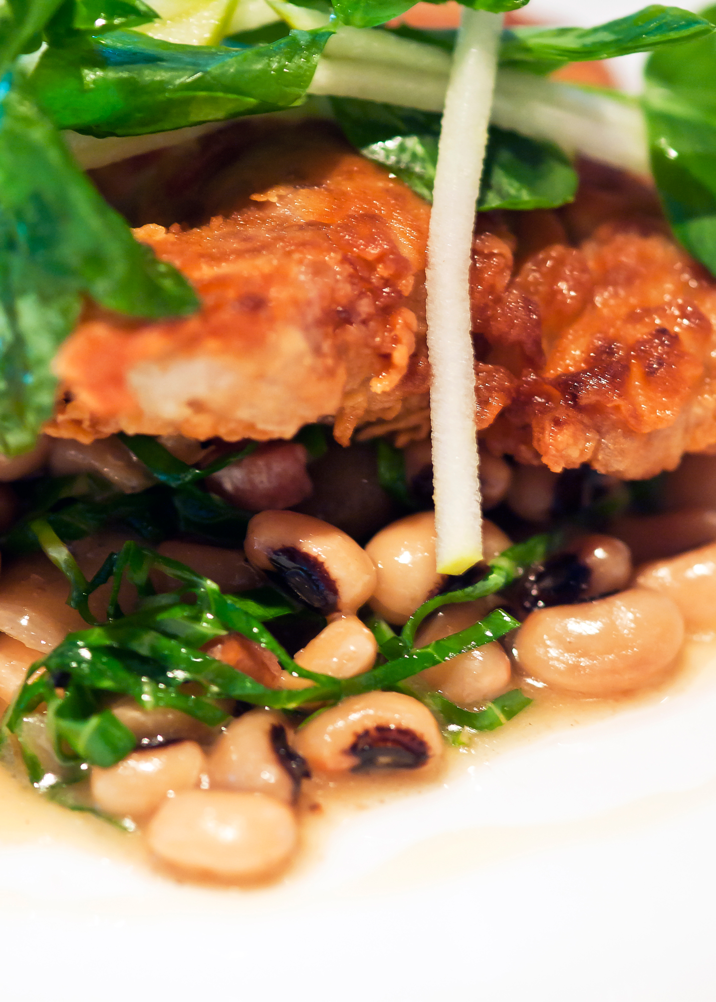 Sweetbreads “Milanesa” – Lightly breaded and perfectly fried sweetbreads with Cippolini onions, apple slivers, black eyed peas, bacon and cider gastrique. This was the first time any of us had had sweetbreads, and we were all dying to try them. Yum. Creamy and light, we see what all the hubbub is about, especially when paired with the freshness of apple. The beans were also great–al dente and wholly satisfying.