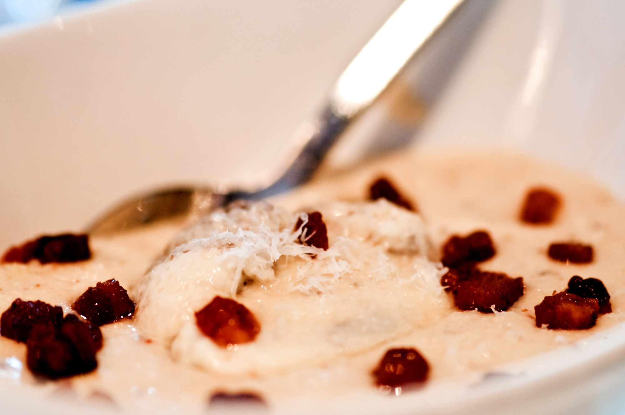 Pork Belly with Tortellini – Crisped portions of pork belly with a sweetish glaze, pork cheek tortellini and rich ham jus. The tortellini and jus would have been a great dish alone; the addition of pork belly made for one rich (and tasty) appetizer.