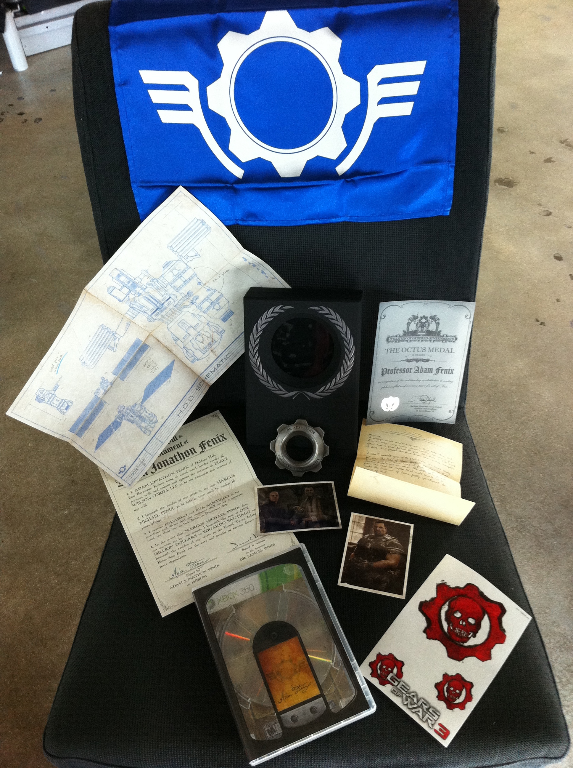 Gears 3 with all it’s attendant paraphernalia. Cool box, cast metal cog, flag, awards, letters, photographs, and Hammer of Dawn blueprint.