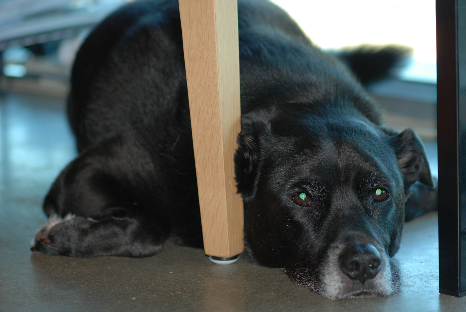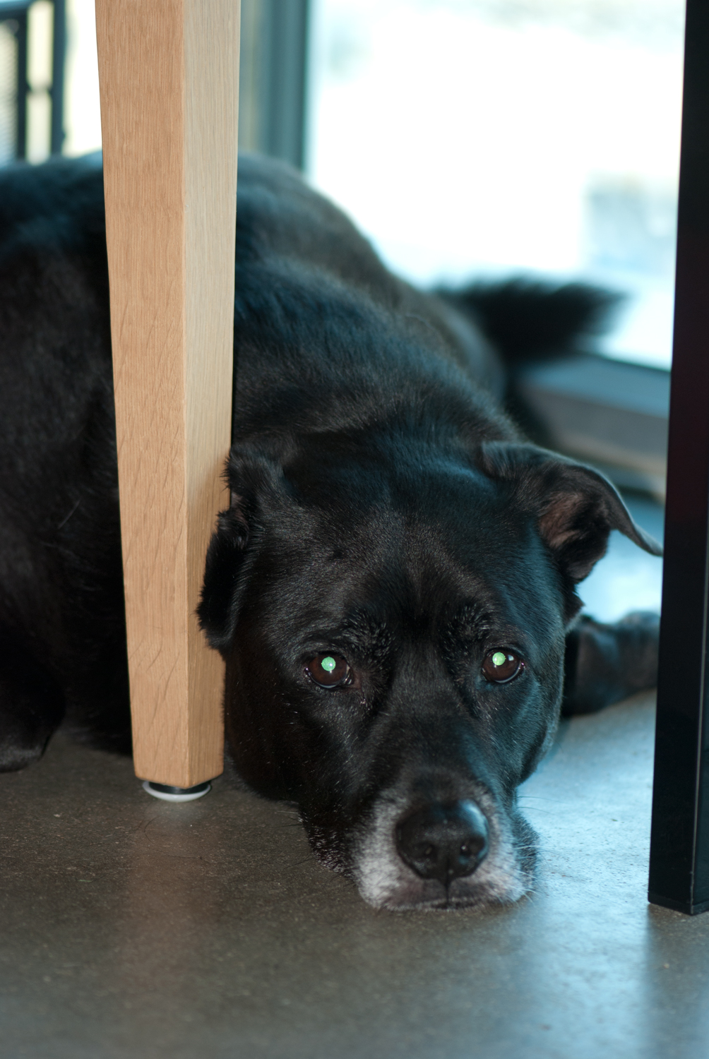The saddest bear I’ve ever seen. We don’t make him squeeze his big body behind a chair under the desk. Really we don’t.
