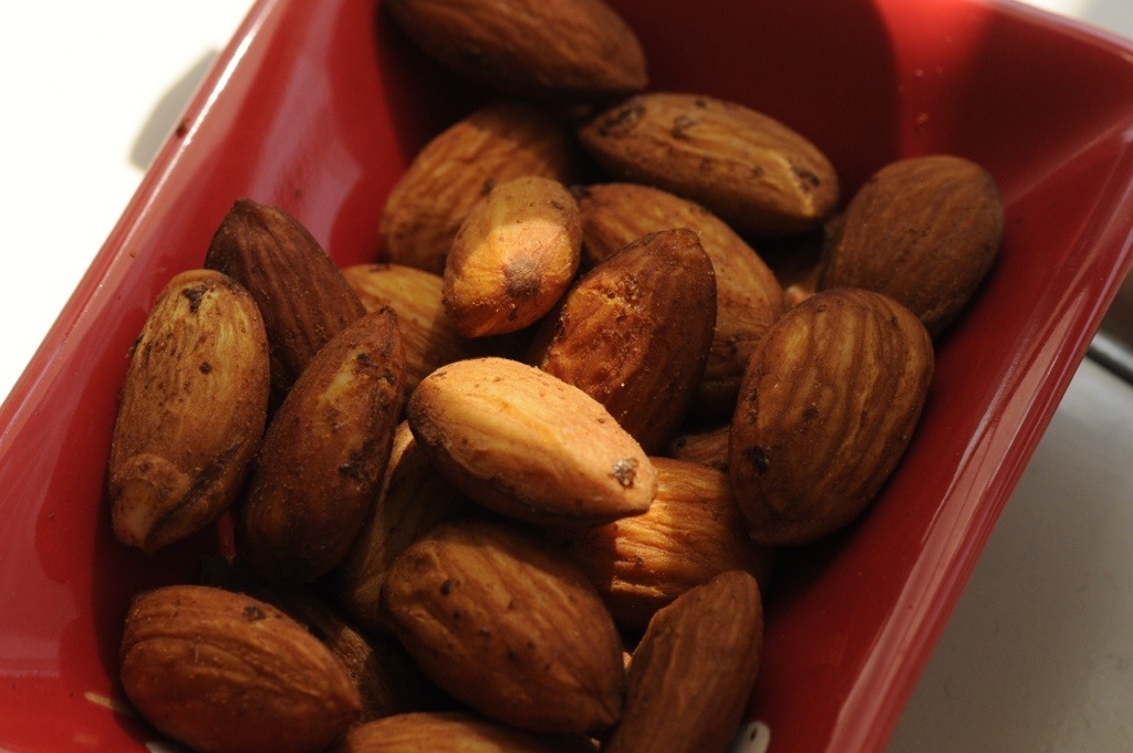 One of my new favorite snacks: spicy almonds with soy sauce.
