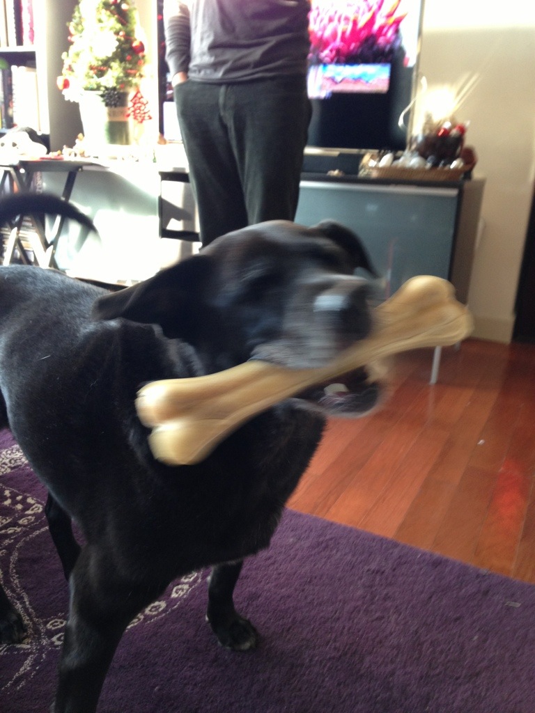 Happiness is … a dog with a big bone on Christmas.