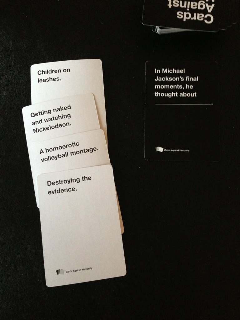 Wrapping up the evening in time for the season premiere of Dr. Who, we ended the evening with Cards Against Humanity. I’m proud to say that I was the most terrible person in the room (yet again)