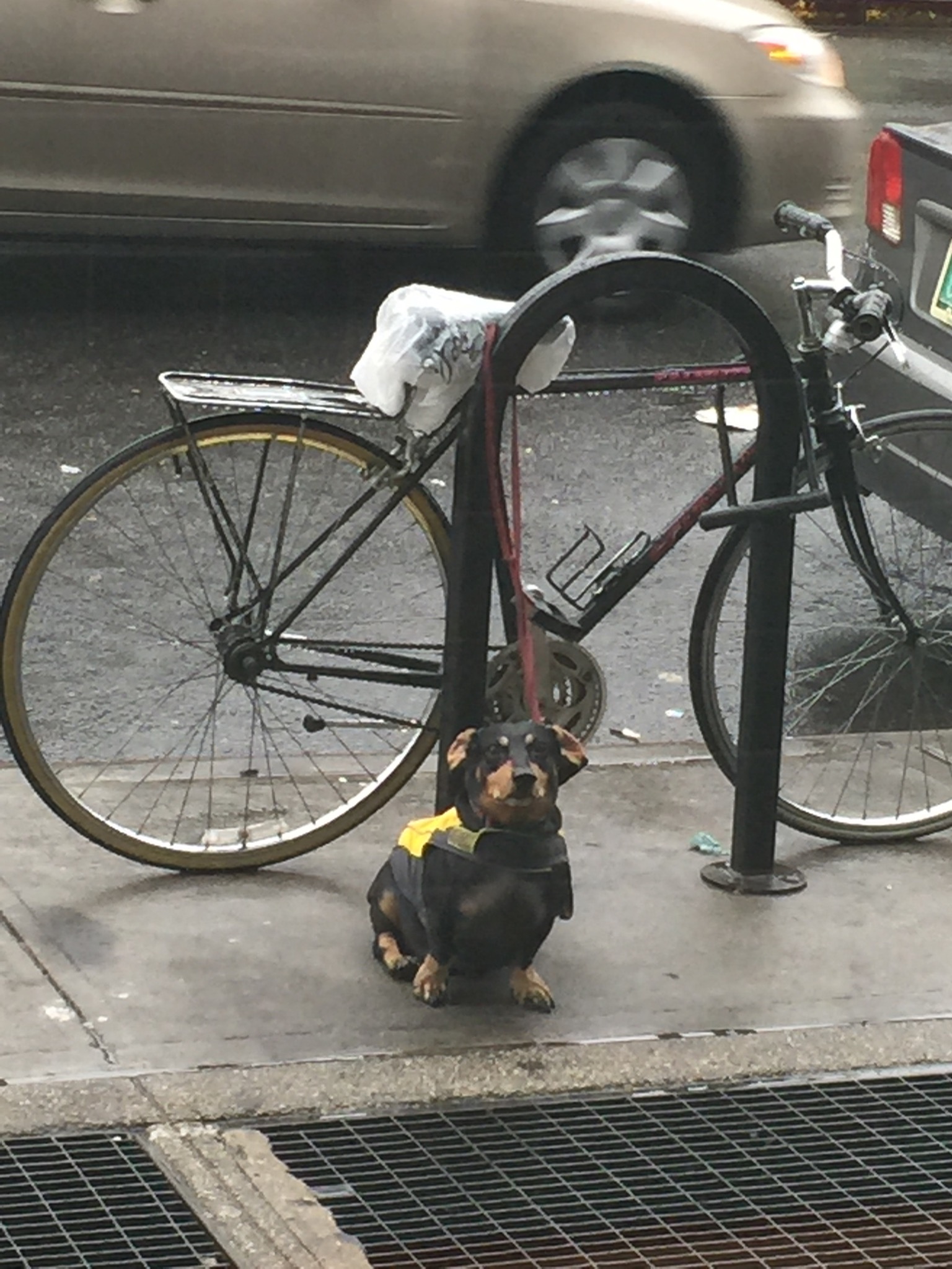 The saddest dog ever – waiting for mommy to get her coffee in the rain.