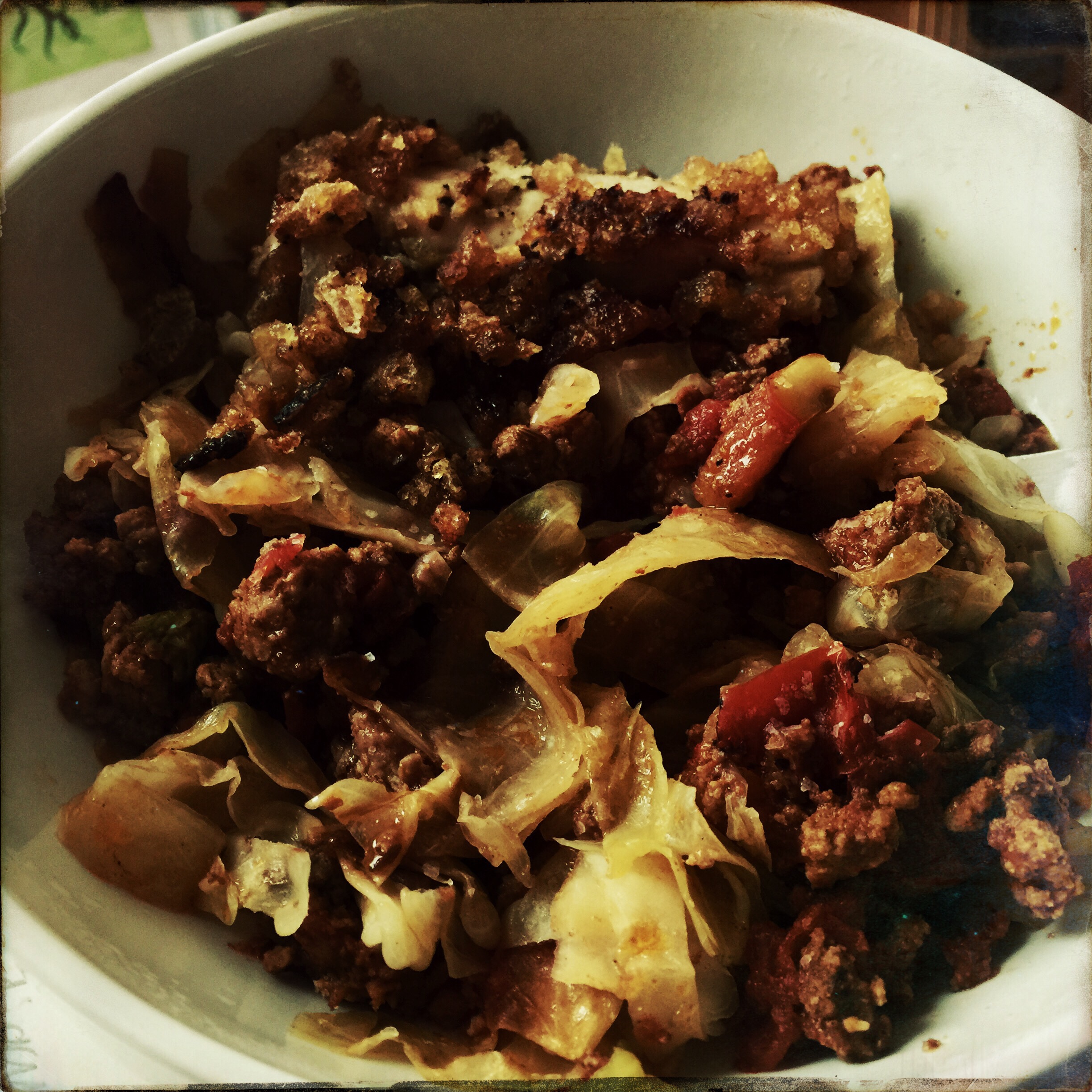 The last of my leftover Unstuffed Cabbage Rolls with the one lonely leftover pork rind crusted chicken tender languishing in my Tupperware containers.