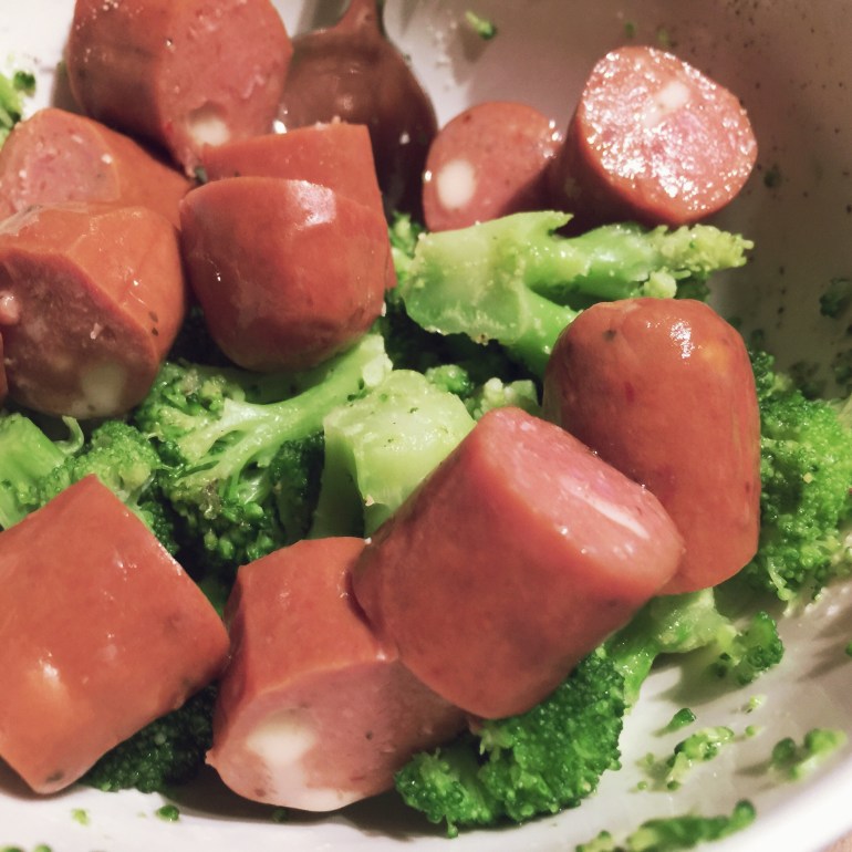 Spent the whole time at the grocery trying to think of something for dinner. Didn’t work. I came home and grabbed some leftover cheese dogs, frozen broccoli and butter.