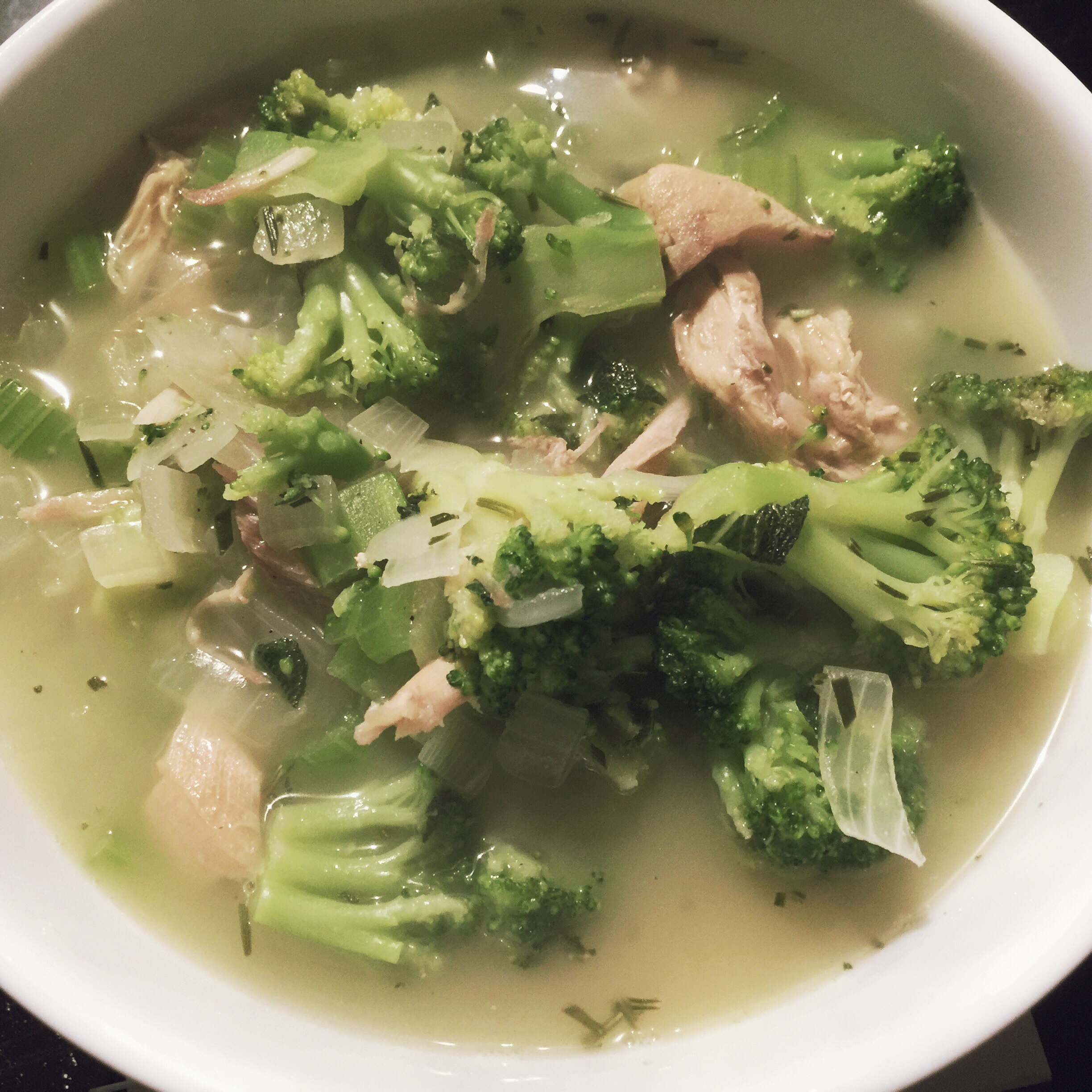 Quick turkey soup with bone broth, celery, onion, turkey & frozen broccoli.