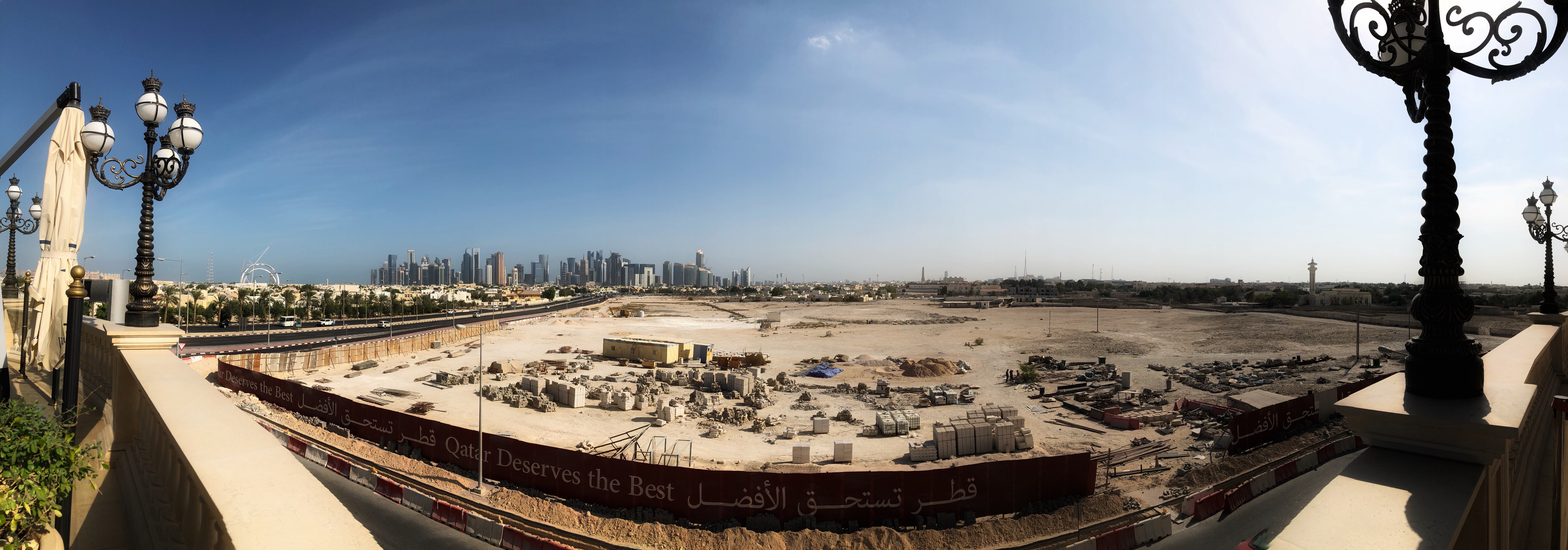 Panoramic of downtown Doha from the mall I was at today – this mall is made to look like a European Town, sports a mini Louvre-style pyramid, and features multiple 250-600 year old imported olive trees.