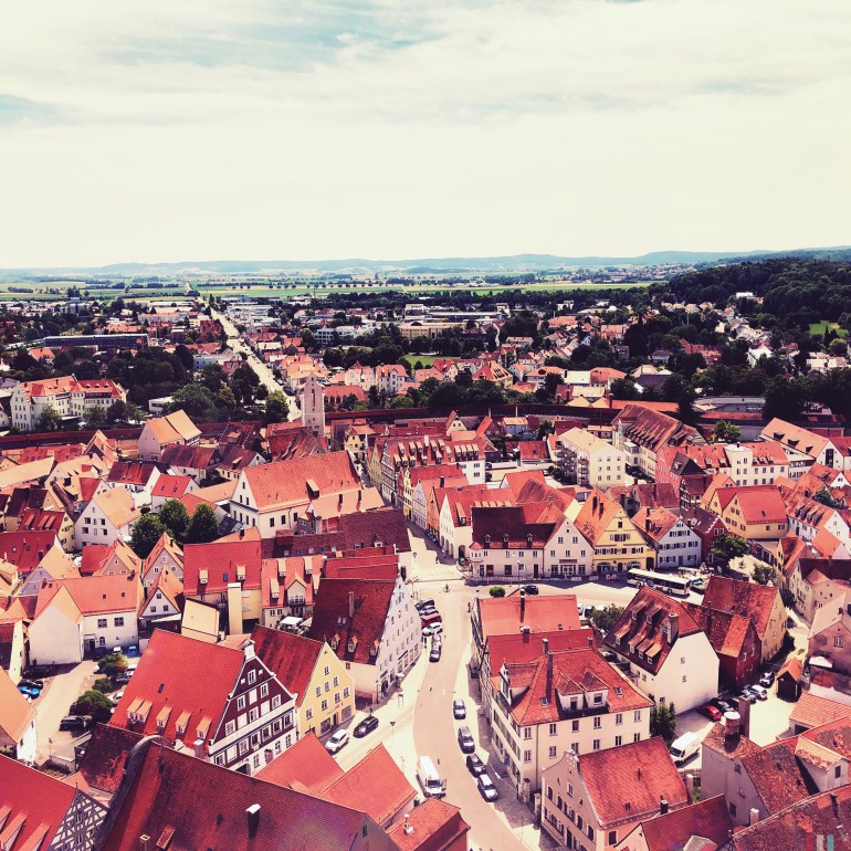 This picture was taken from the top of the bell tower in Nordlingen. See the city walls? This city was built in the crater of a meteorite strike. Super cool π