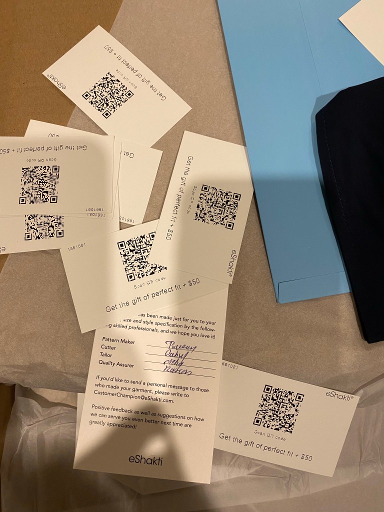 Super excited to have gotten my eShakti shipment really quickly – and that they’ve not only started including maker information, but have finally started a referral program of sorts. I sing their praises from the rooftops all the time – and now friends can get a discount! 🙌