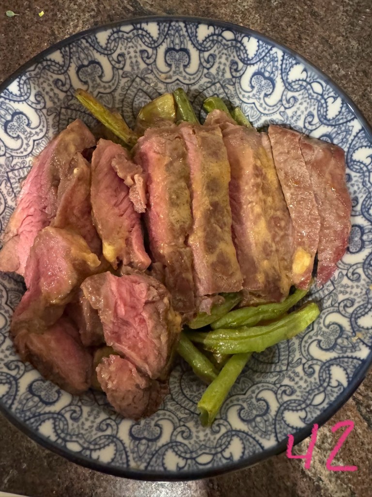 Well, here – this one definitely doesn’t have a recipe: air fryer roasted potatoes, green beans & ribeye with miso butter. 42g protein and I aaaalmost hit my goal for the day. 😋 Forgot how hard it is to get in that much protein without convenience junk food.