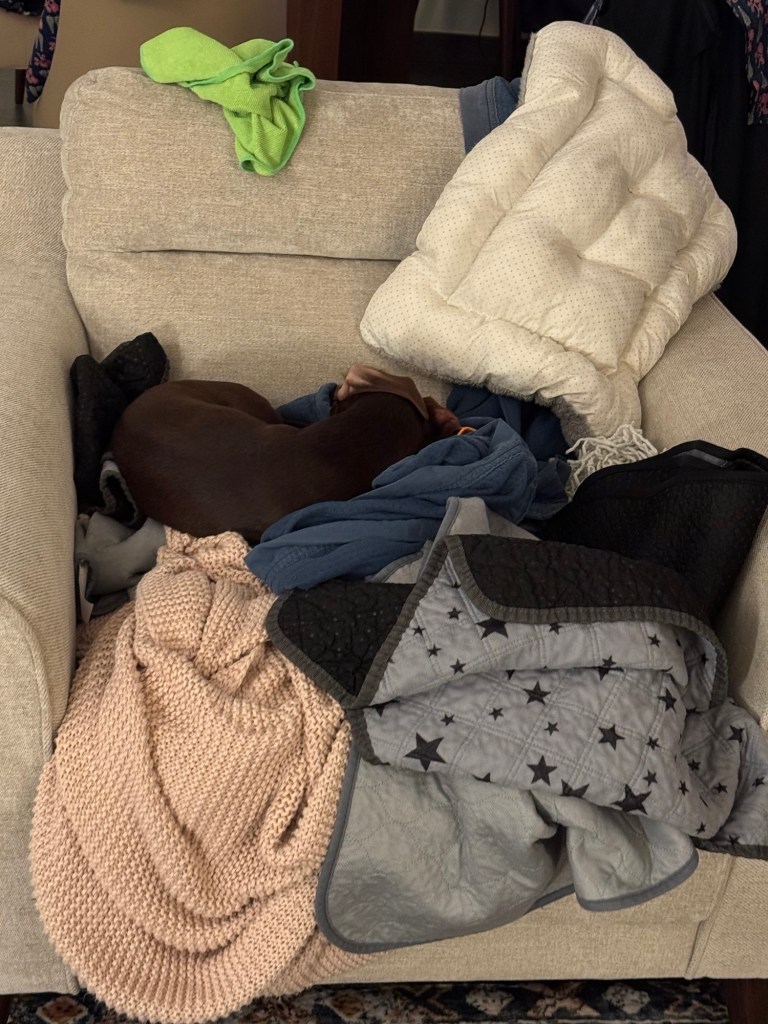 He’s either protesting the laundry on the chair or has found a new cave 🤣