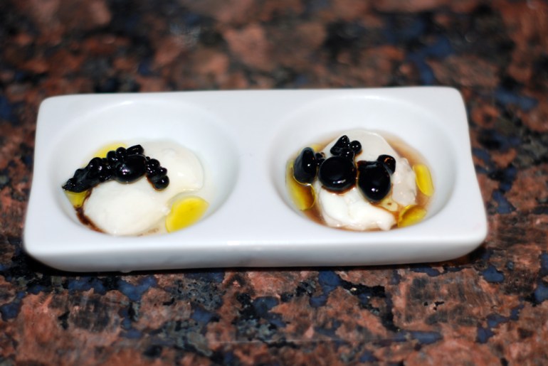 The Balsamic Vinegar Pearls were successful as well. This preparation called for mixing the vinegar with Agar-Agar, bringing it to a boil, and pipetting small spheres into a cold bowl of oil to set. Although we had drama with the directions–I’m fairly certain they were translated from French, and aren’t the most specific when it comes to things like how much oil to put in the freezer and what you’re looking for to tell if anything is ready–the pearls turned out semi-pearl ish.