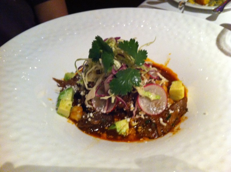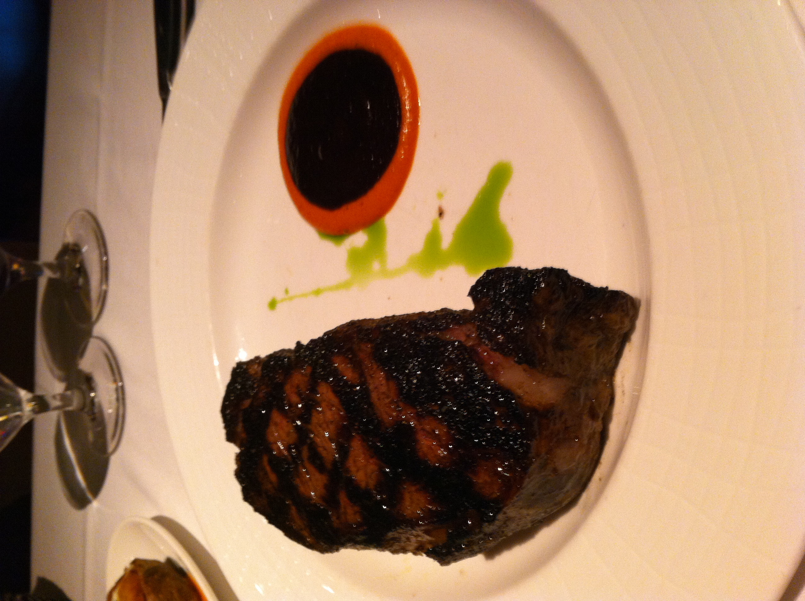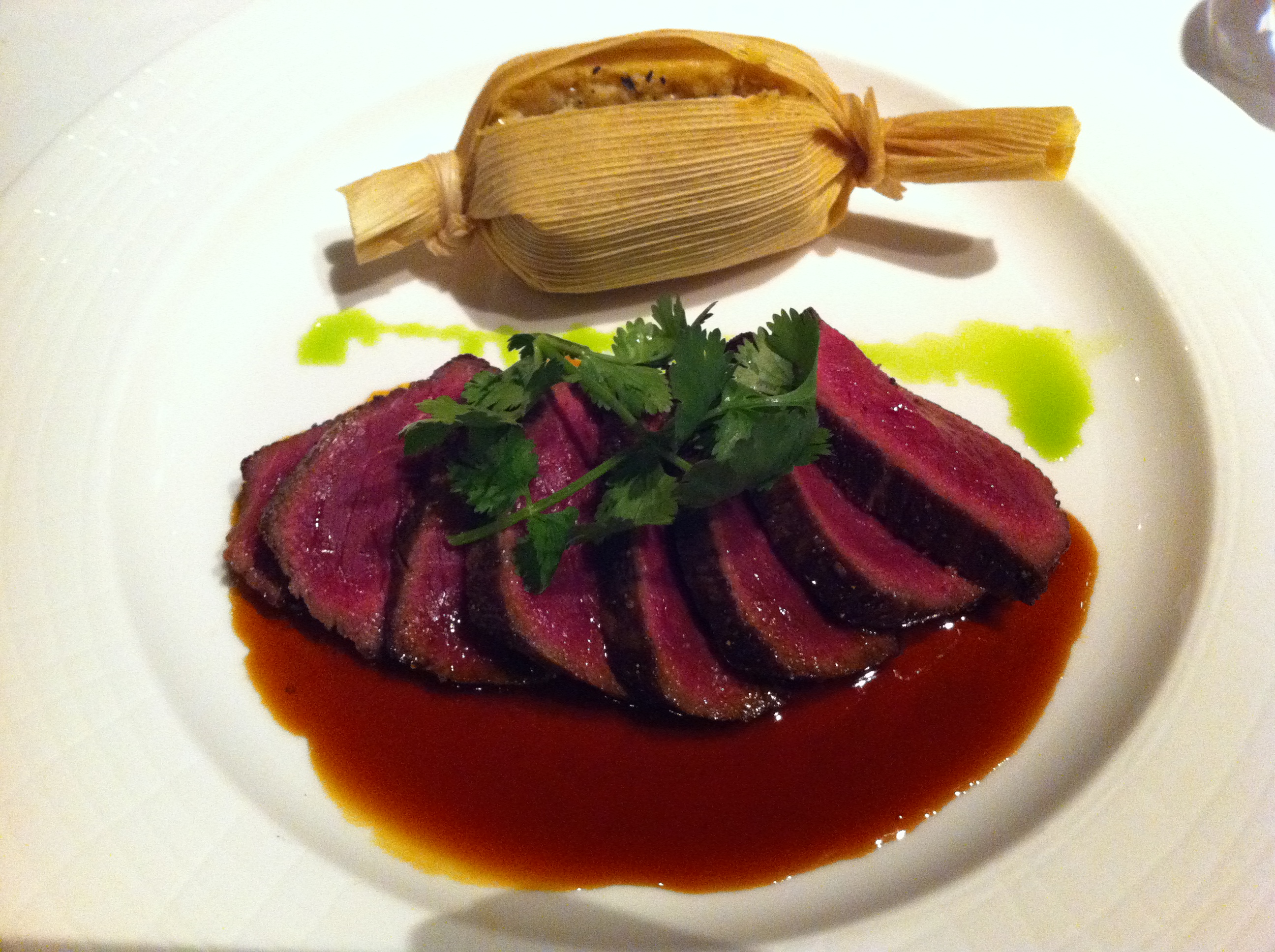 Dry and fairly tasteless cornbreadVenison with sweet sauce, basil oil drizzle and joyless tamalePerfectly-cooked spice rubbed NY strip with sickly sweet BBQ and nice chipotle sauces and basil oil trickleTender lamb stew with decent if sweet flavor