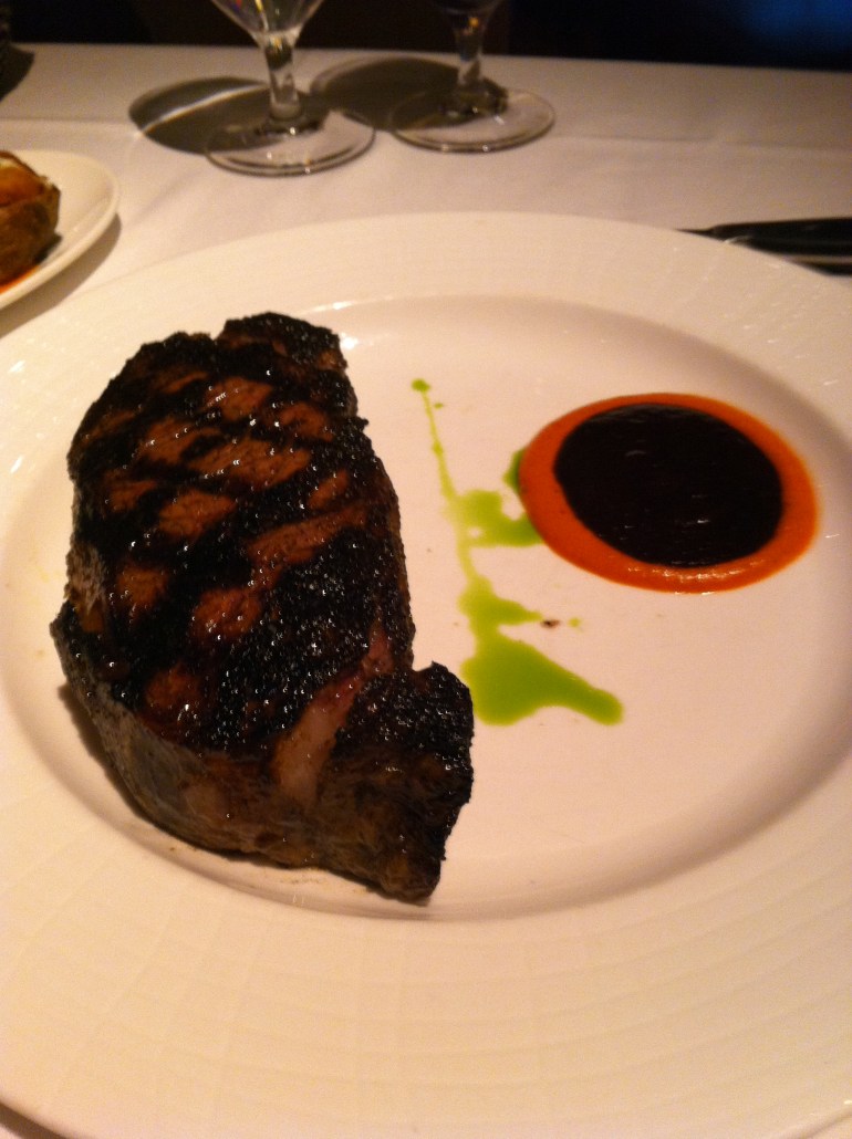 Tenderloin Rossini: Tiny little perfectly-cooked and super tender beef medallions with foie gras, wild mushroom duxelle, baby arugula and truffle mayo on adorable little buns. This was my DH’s favorite dish of the entire trip. And it has mushrooms. I see a glimmer of hope in my future! Not only did he like the pear on the Fleur burger, he liked the mushrooms on this one. So, what have we learned about vacation, class? That it’s the perfect time to spring foods my DH doesn’t think he likes on him in the guise of gourmet. Bwa-ha-ha.