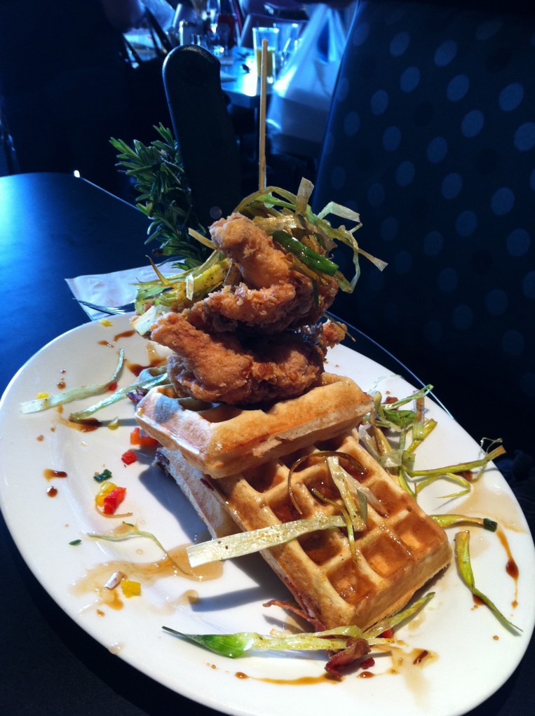 Andy’s Sage Fried Chicken & Bacon Waffle Tower: 2 breasts of the best fried chicken I’ve ever tasted with 4 impossibly fluffy bacon-studded waffles, a hot maple reduction syrup, the tiniest amount of diced red peppers ever and fried leeks.