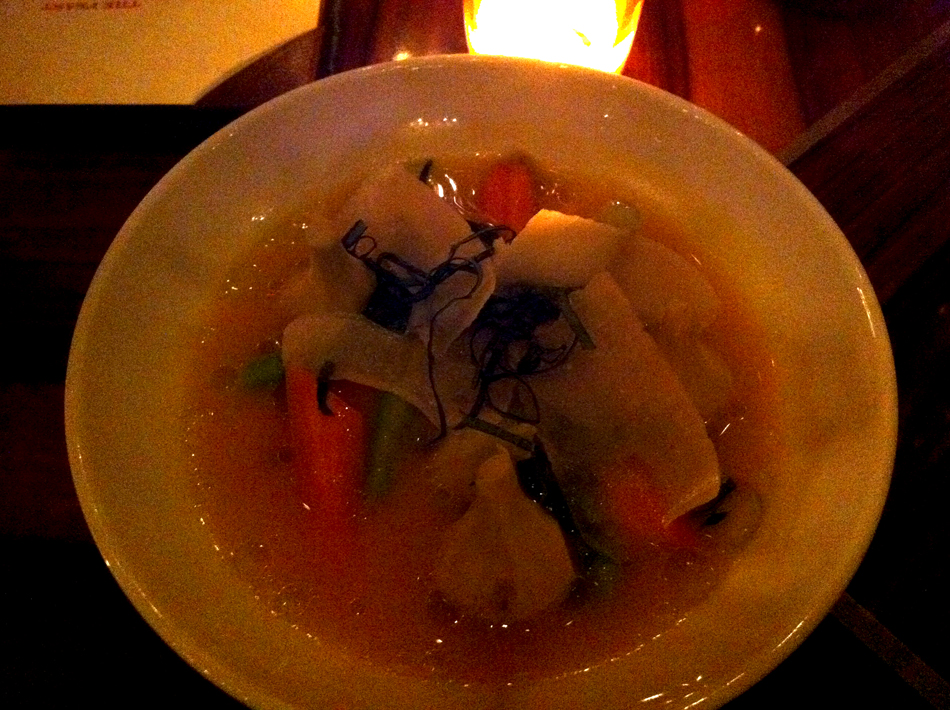 “In the Shower” Mac & Cheese – Possibly my favorite dish of the night and the one must-have on my list. A light cheesy pasta with brunoise vegetables and perfectly-cooked lobster chunks. Why “in the shower”? When Chef Keller was on Top Chef Masters, he made this dish during a challenge–cooking in a dorm–and the only place large enough to drain his macaroni was the shower. Hence the name.