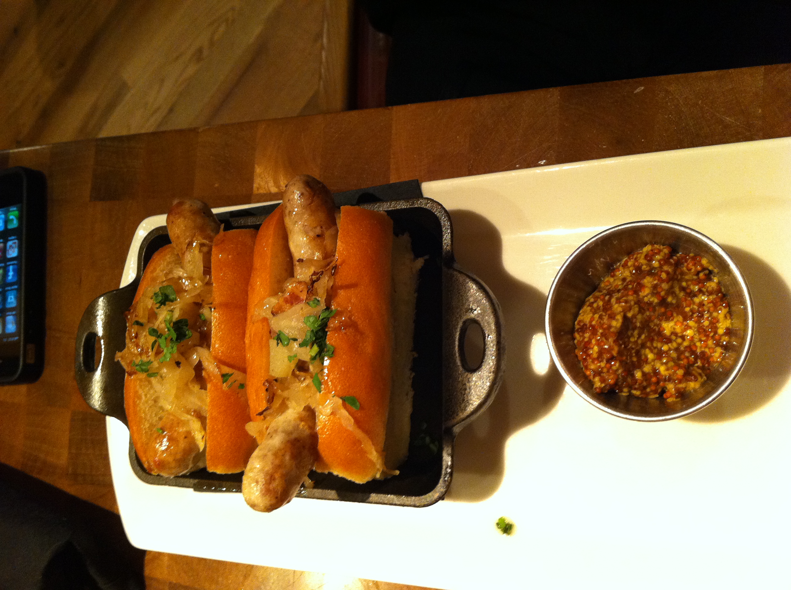 Bratwurst: Baby braised brats with bacon and potato on pillowy little rolls.