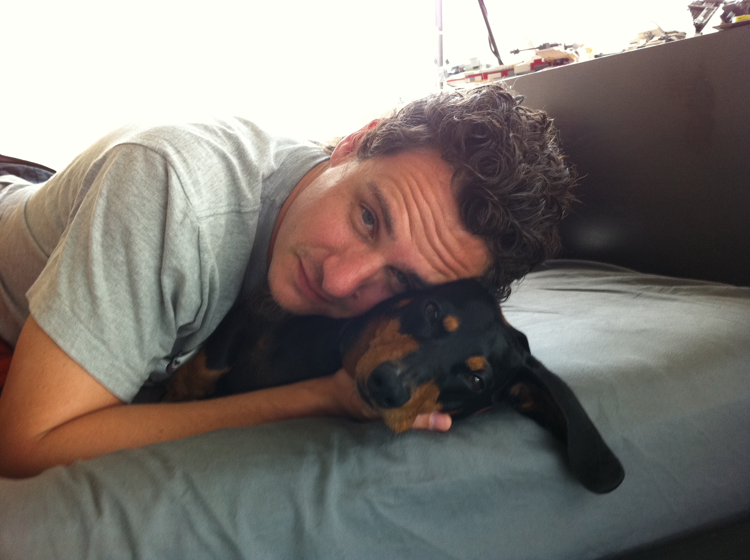 This version incorporates some light color correction and some fairly hefty blurring/halftoning of the background. I hate the car, but short of creating a mask and running the risk of making my DH look like he was somewhere he was not, I decided to (almost) live with it.